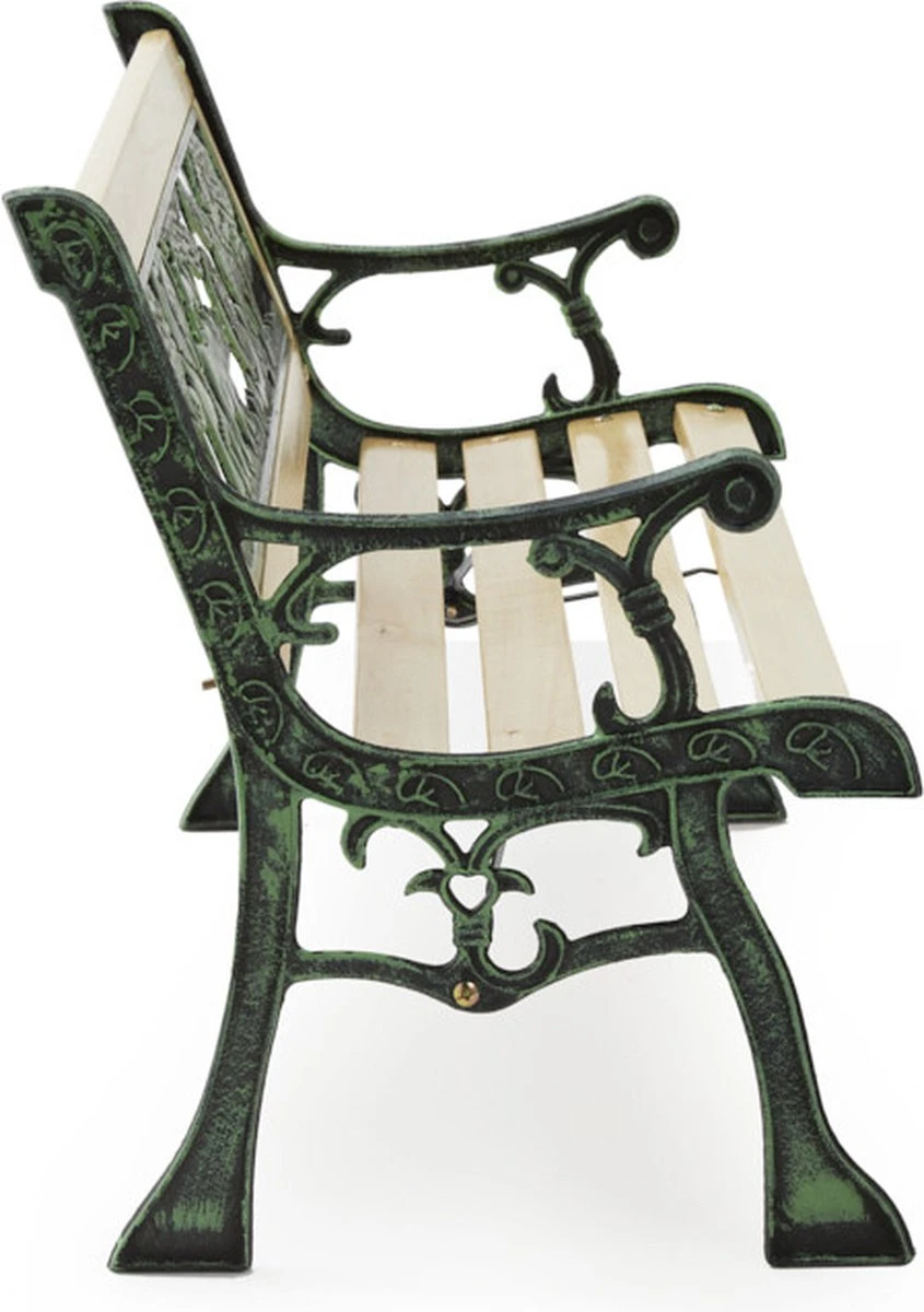 De armleuning en poten zijn van sterk smeedijzer, dus hij staat lekker stevig. Het zitgedeelte is van onbewerkt hout. Je kunt het dus nog naar eigen smaak beitsen of verven als je dat zou willen. Het bankje is redelijk weersbestendig, maar berg hem voor de zekerheid op bij nat herfst- of winterweer om slijtage te voorkomen. Om hem goed te onderhouden werk je hem elk jaar bij met een nieuwe beitslaag.
